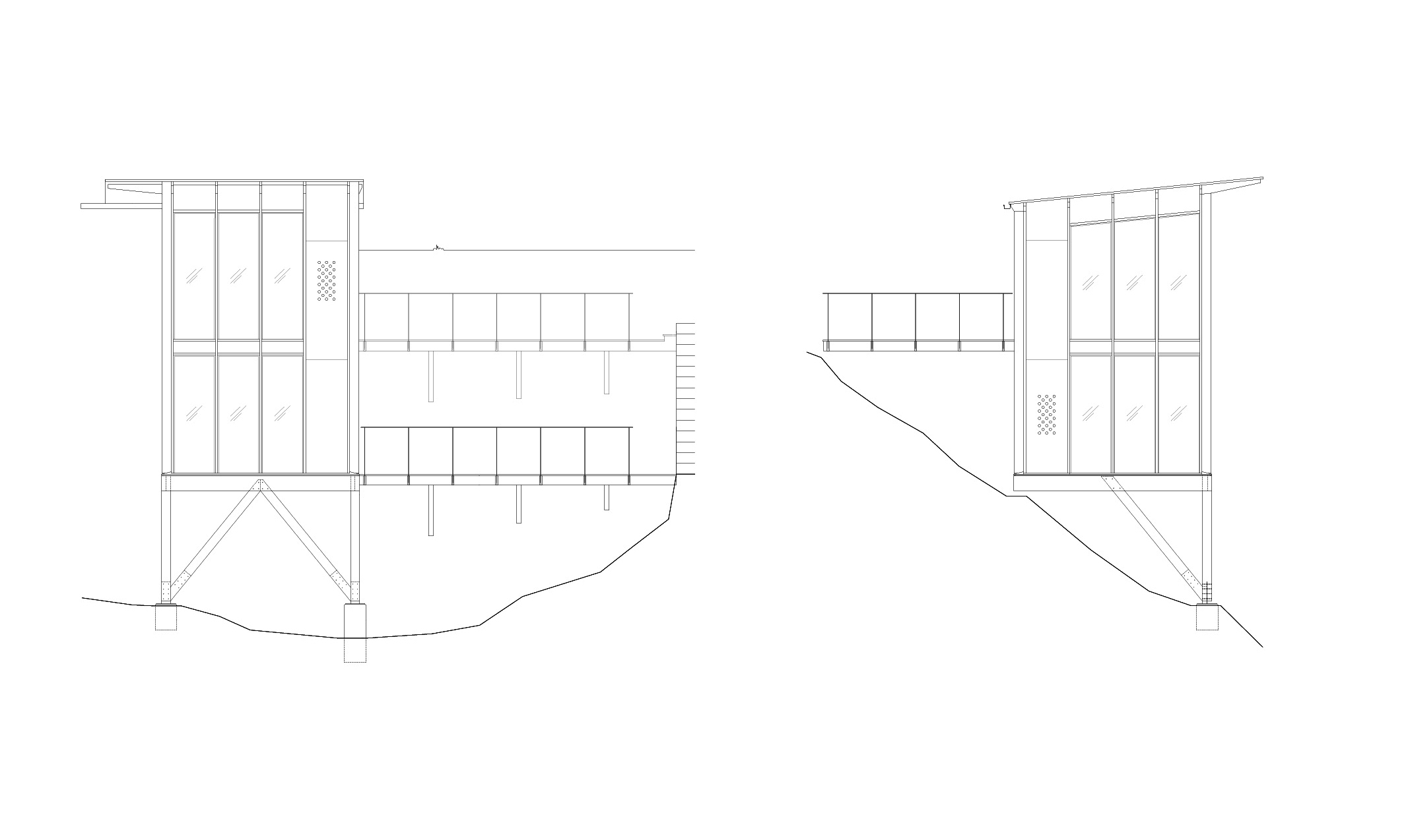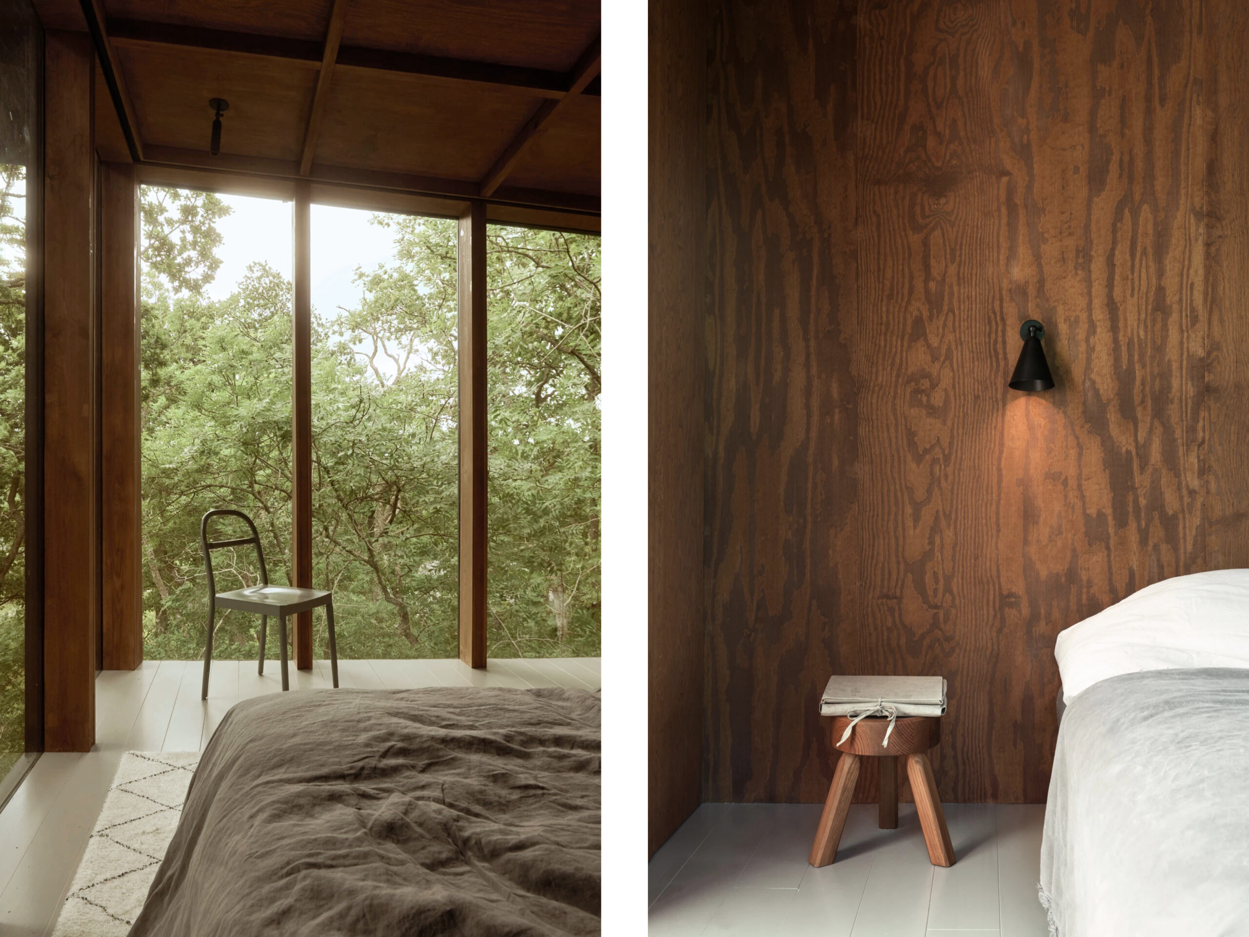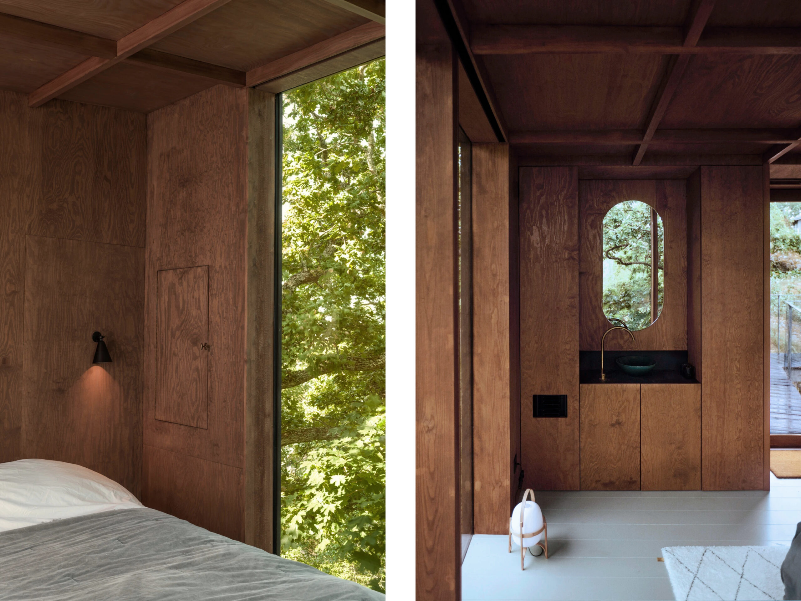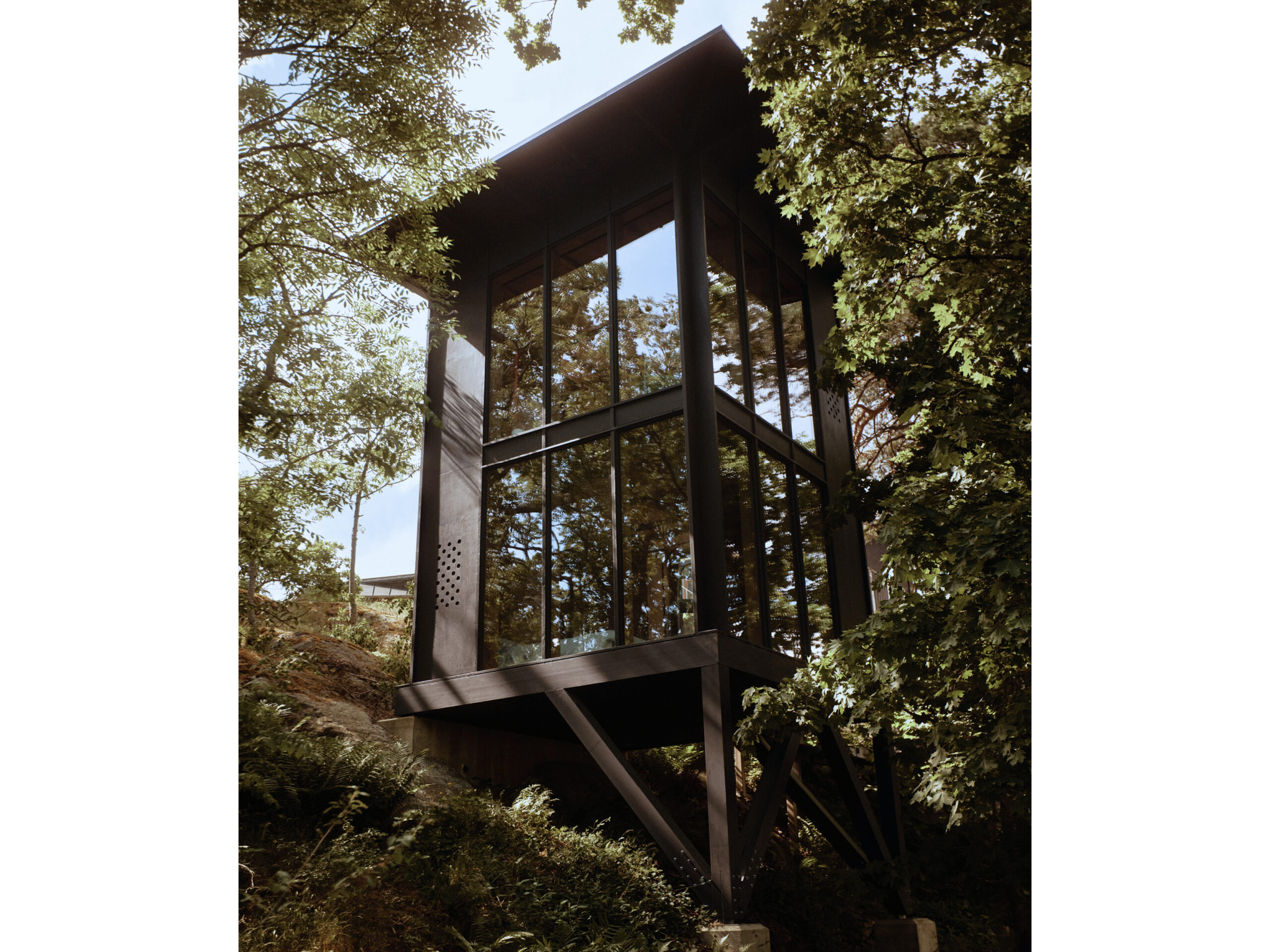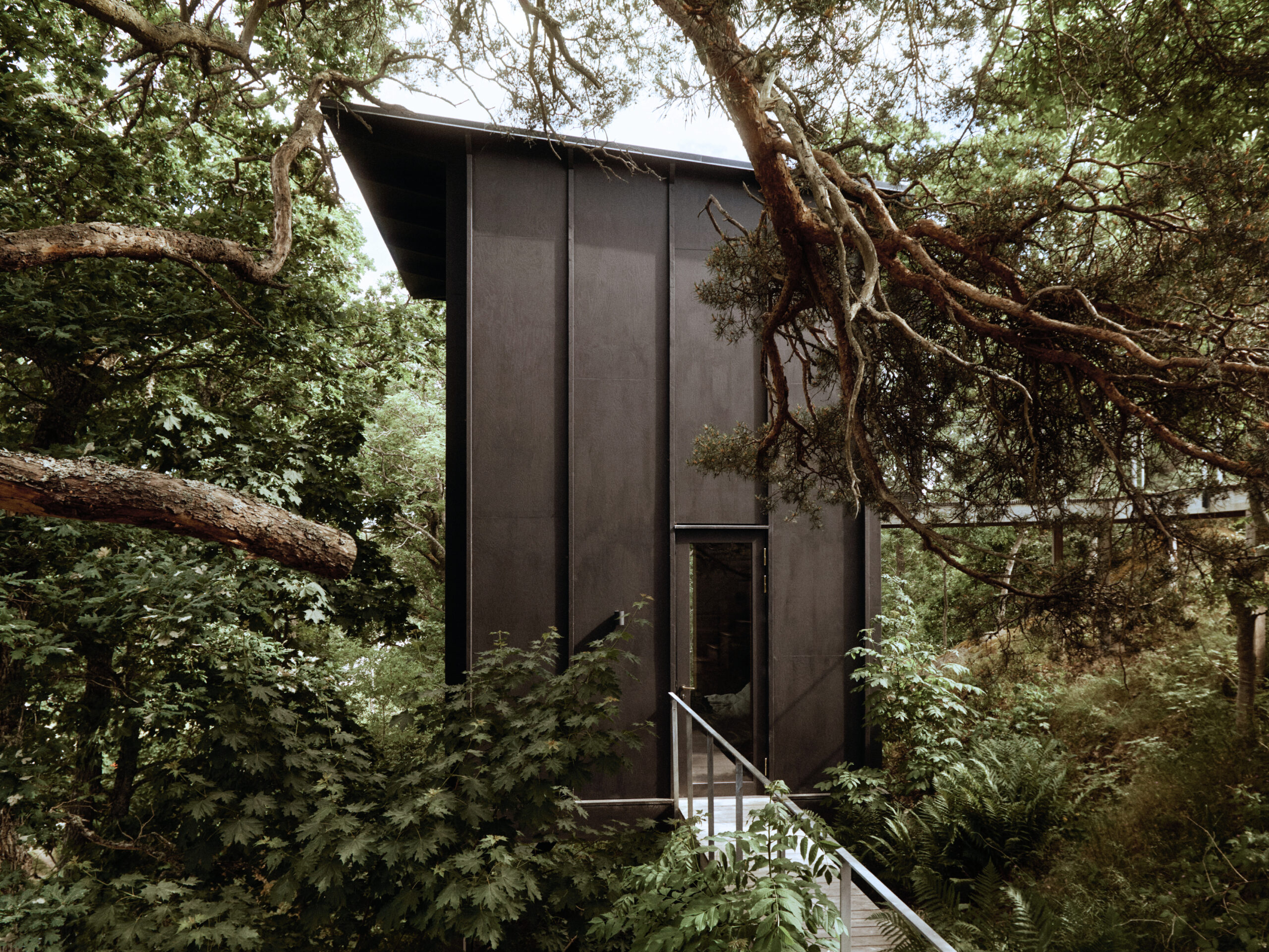 A new guest house in Värmdö complements the main summer residence, perched on a steep pine-covered hillside. Discreetly integrated into the landscape, it contains two levels with a bedroom, bathroom, and storage on each floor, oriented toward forest and sea views. A walkway connects it to the main house while maintaining privacy. Built from timber and glass on a truss frame anchored to the slope, it features ventilated perforated walls and a black-painted facade that blends with the woods. Inside, dark plywood walls, a timber-batten ceiling, and grey floors create a warm, textured interior.