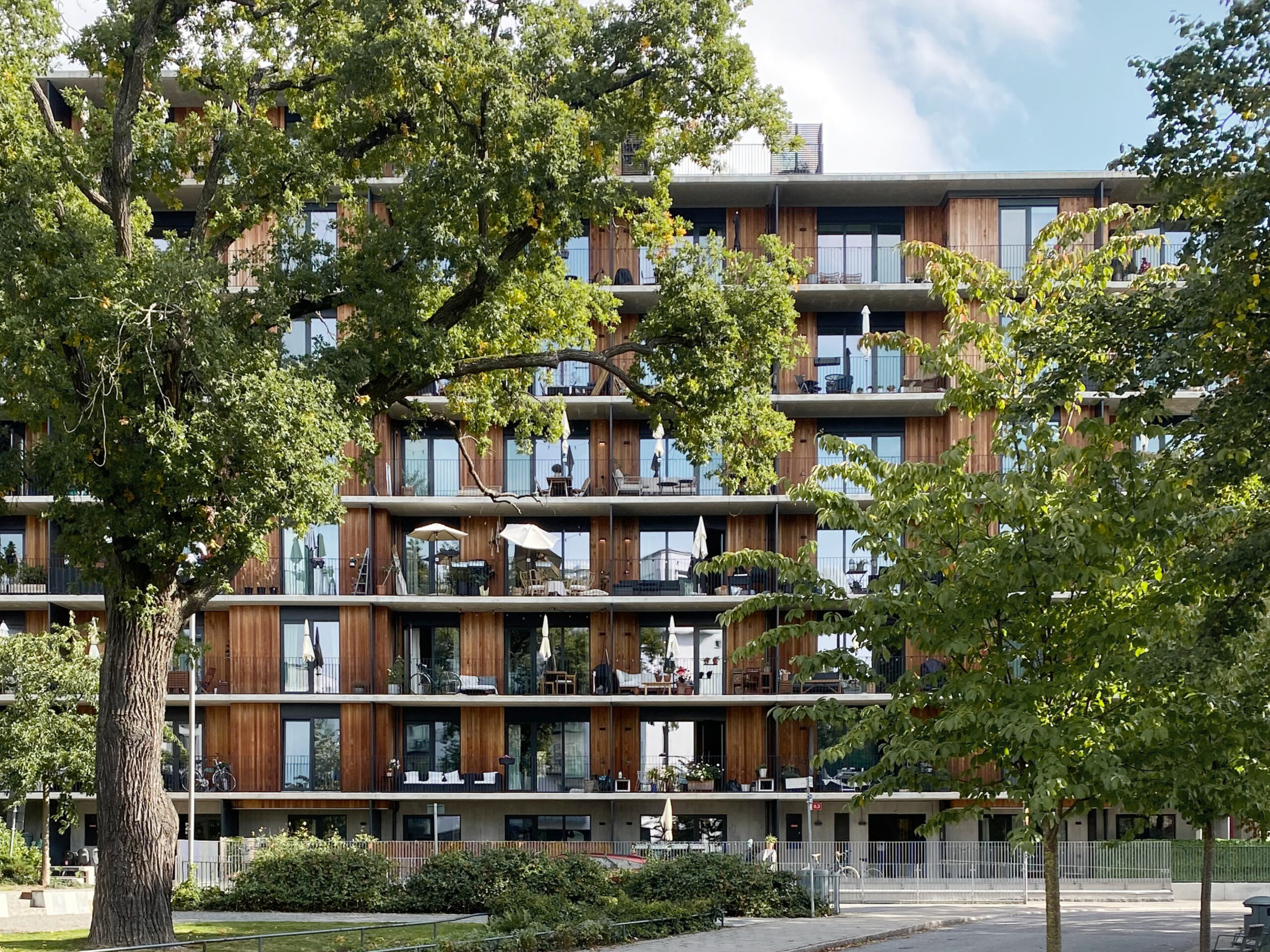 Balneum, located on the waterfront at Gröndal Strand in central Stockholm, contains 134 apartments arranged along a steep slope to form a striking silhouette while minimizing its visual mass. The design addresses the nearby Essingeleden bridge’s noise and privacy challenges with a closed east facade of light-colored concrete modules, contrasting with open sides featuring generous glazing, warmer materials, and continuous balconies with custom railings. This balance of strength and softness gives Balneum a distinctive character on its dramatic site.