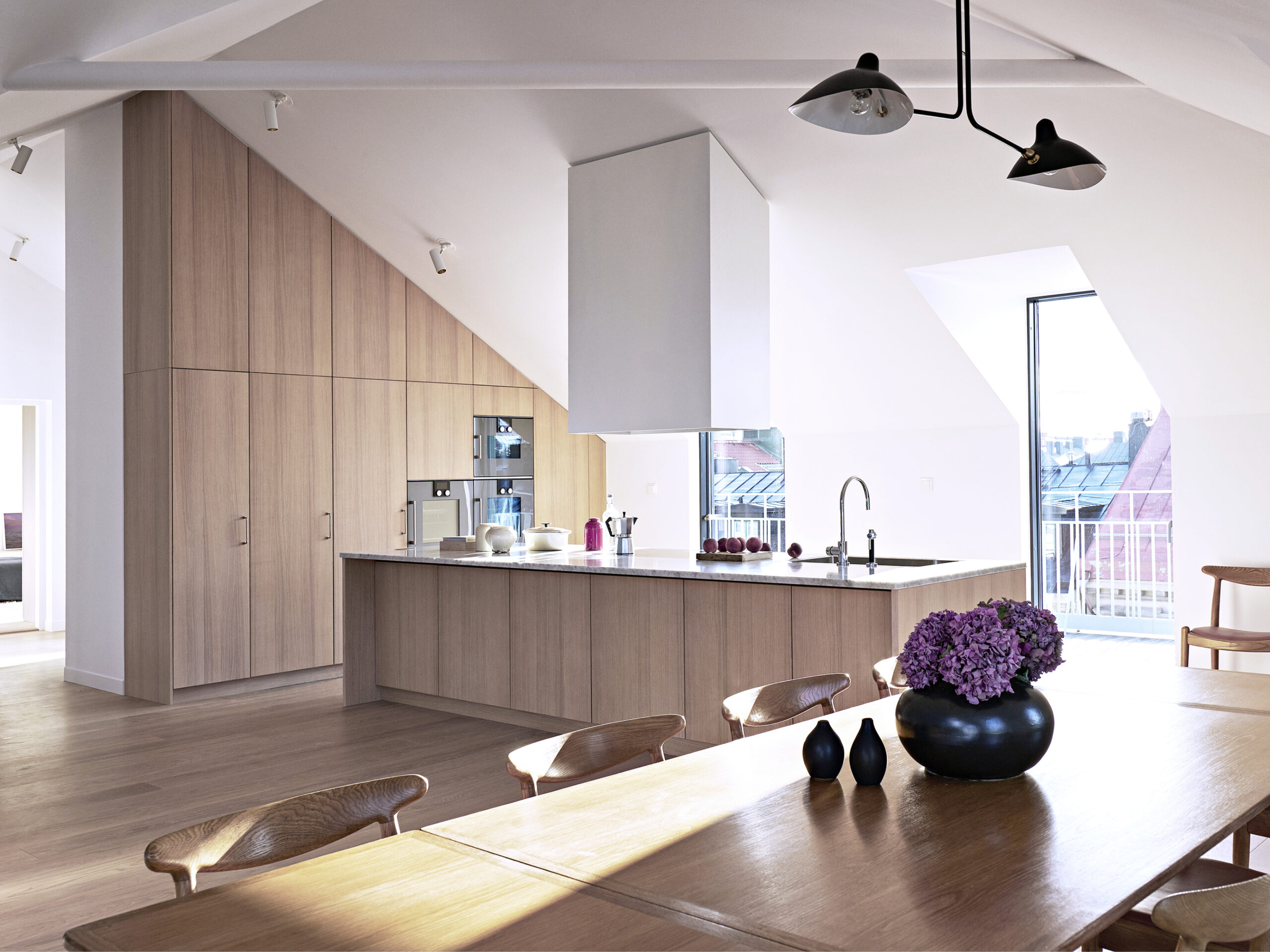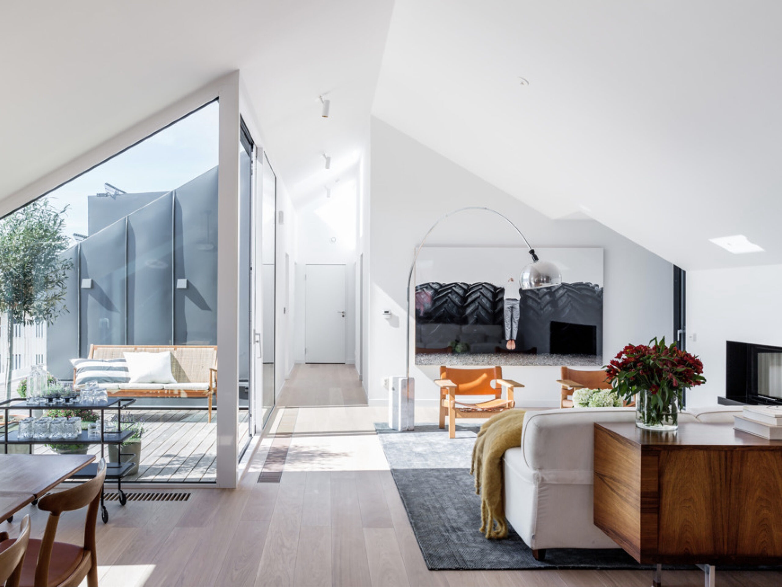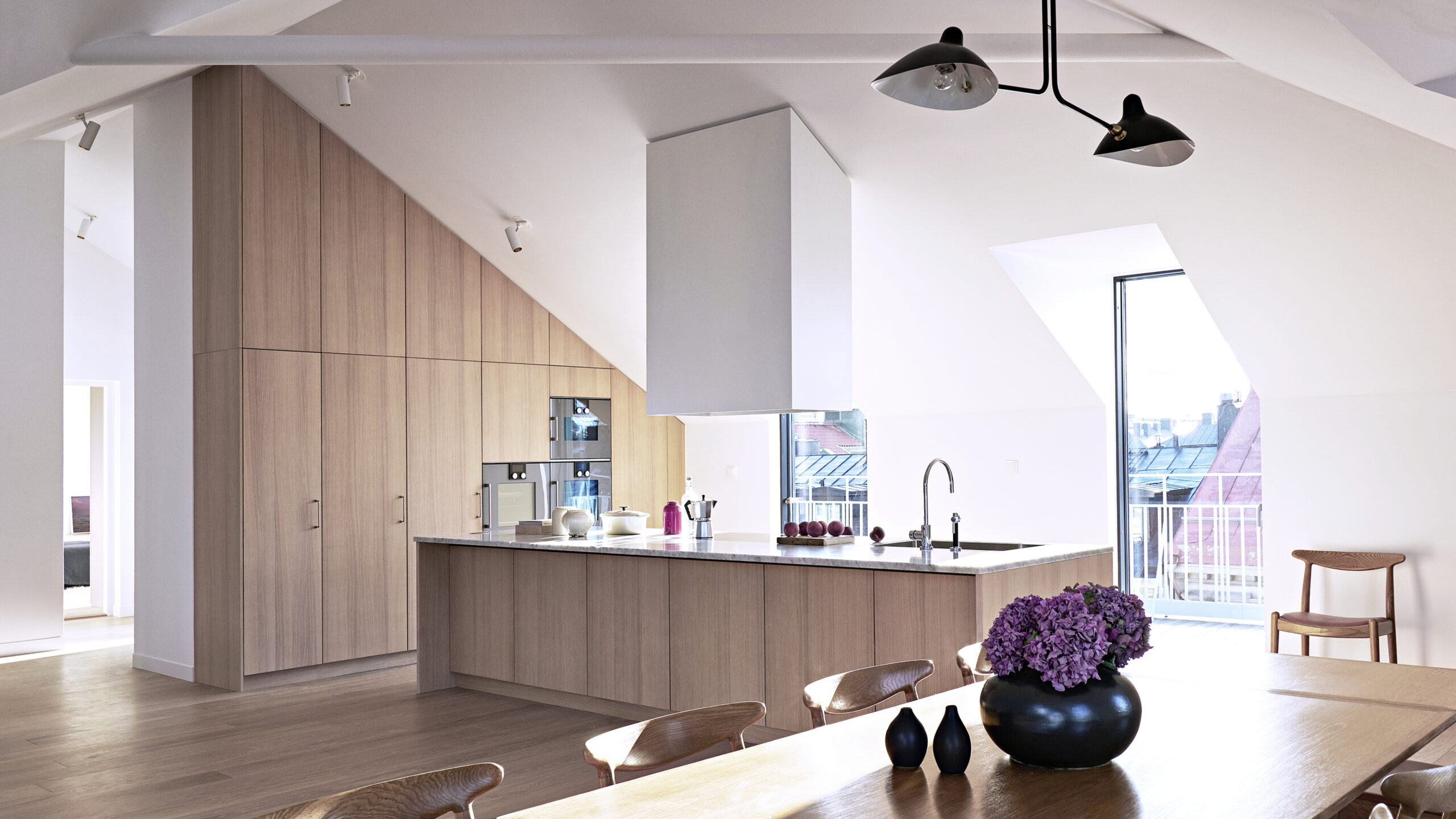 A new penthouse with two apartments crowns a former post office designed by Erik Lallerstedt. Each apartment features a spacious living room with open-plan kitchen, custom oak carpentry, and built-in fireplaces. Master bedrooms include generous bathrooms and wardrobes, while a continuous terrace (accessible from every room) features bespoke steel railings. Sloping ceilings follow the roof form, and glazed cut-outs create larger terrace areas for outdoor seating.